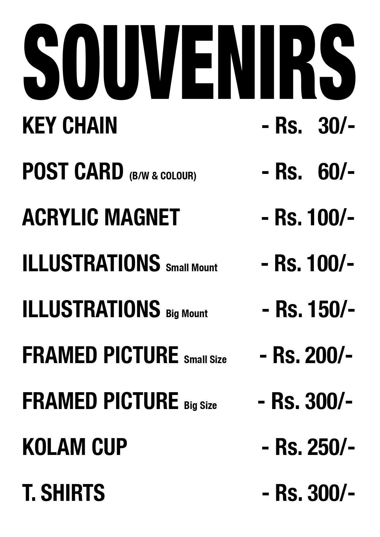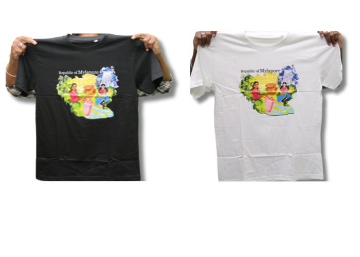 T-shirts. Illustrations. Magnets. Palm-leaf boxes. At festival Info Desk. Next to Theradi. opp. Ravi store. Sannidhi Street zone. 6.30 pm onwards.